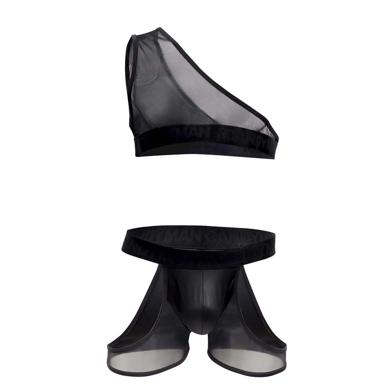 Body Candyman 99474. Body 2 pièces avec un croc top asymétrique en tissu mesh et tansparent. Bande elastique logotée Candyman. Et un bas combinant tissu mesh et opaque sur la poche avant. Ouvert sur les côtés pour un max de sensualité. 94% Nylon, 6% Elasthanne.
