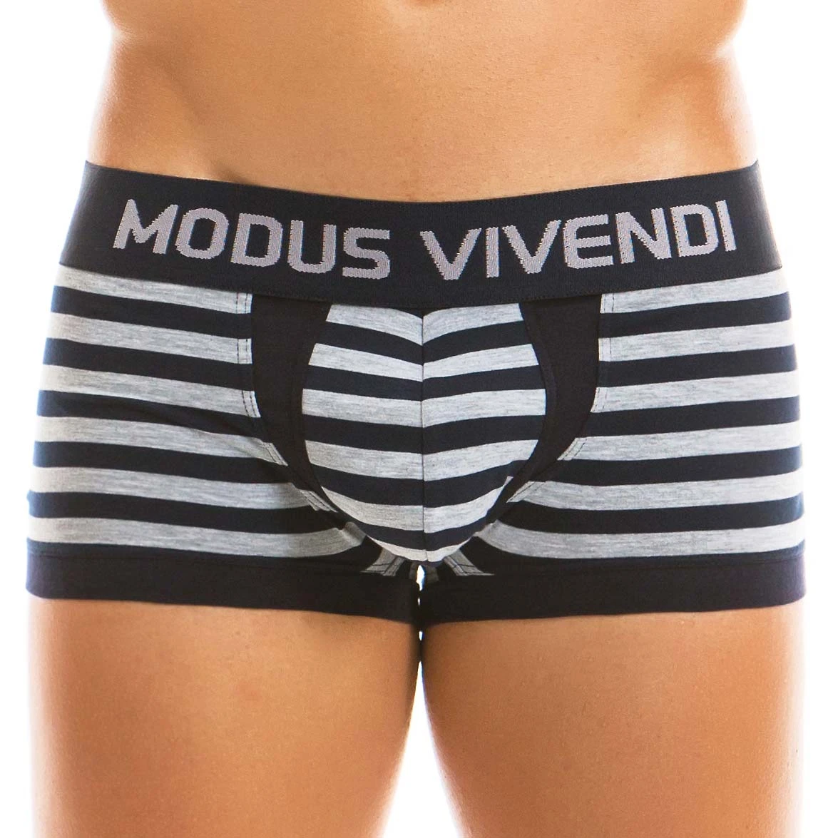 Boxer Modus Vivendi Stripped 11921. Boxer Taille basse, avec une large ceinture logotée Modus Vivendi. Grâce au mélange des matières ce sous-vêtement devient incontournable pour la pratique de votre sport préféré. Rayures horizontales de deux couleurs : grises et noires. 96% Coton, 4% Elasthanne.