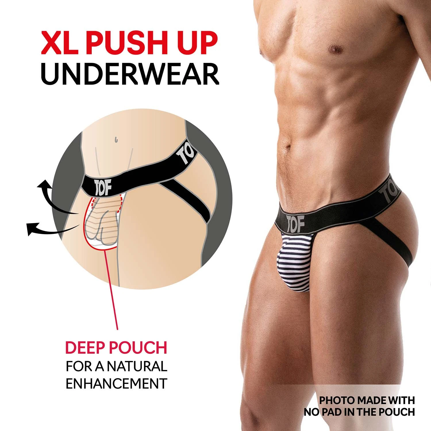 Jock Strap Stripes TOF PARIS TOF113N. Jock Strap marinière en tissu jersey de coton-élasthanne doux et confortable. Poche frontale doublée avec un effet push-up qui vous assure un excellent maintien.Très agréable à porter. Ceinture élastique logotée au nom de la marque. 96% Coton, 4% Elasthanne.