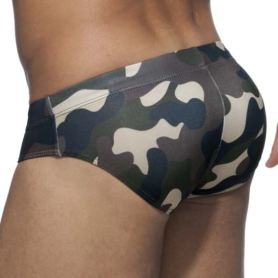 Slip de Bain Addicted New Camo ADS130. Mettez en avant vos atouts avec le système Pack Up amovible (mousse fine et discrète) sur le devant pour un galbe parfait même lorsque vous sortez de l eau. Ceinture élastique avec cordon de serrage à l’intérieur. Logo AD en silicone sur la ceinture. 80% Polyamide, 20% Elasthanne.